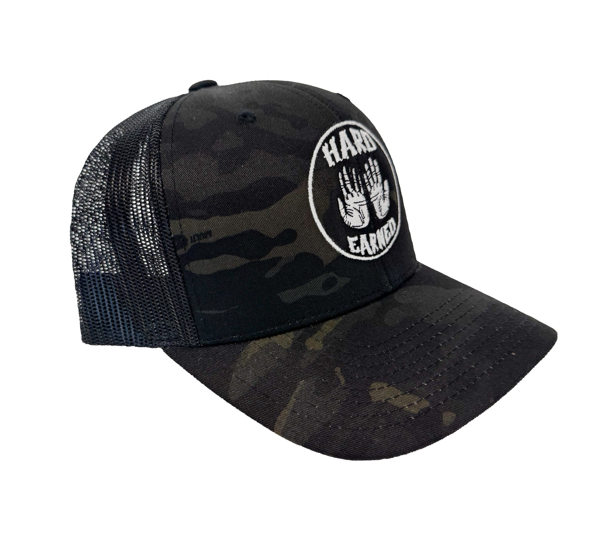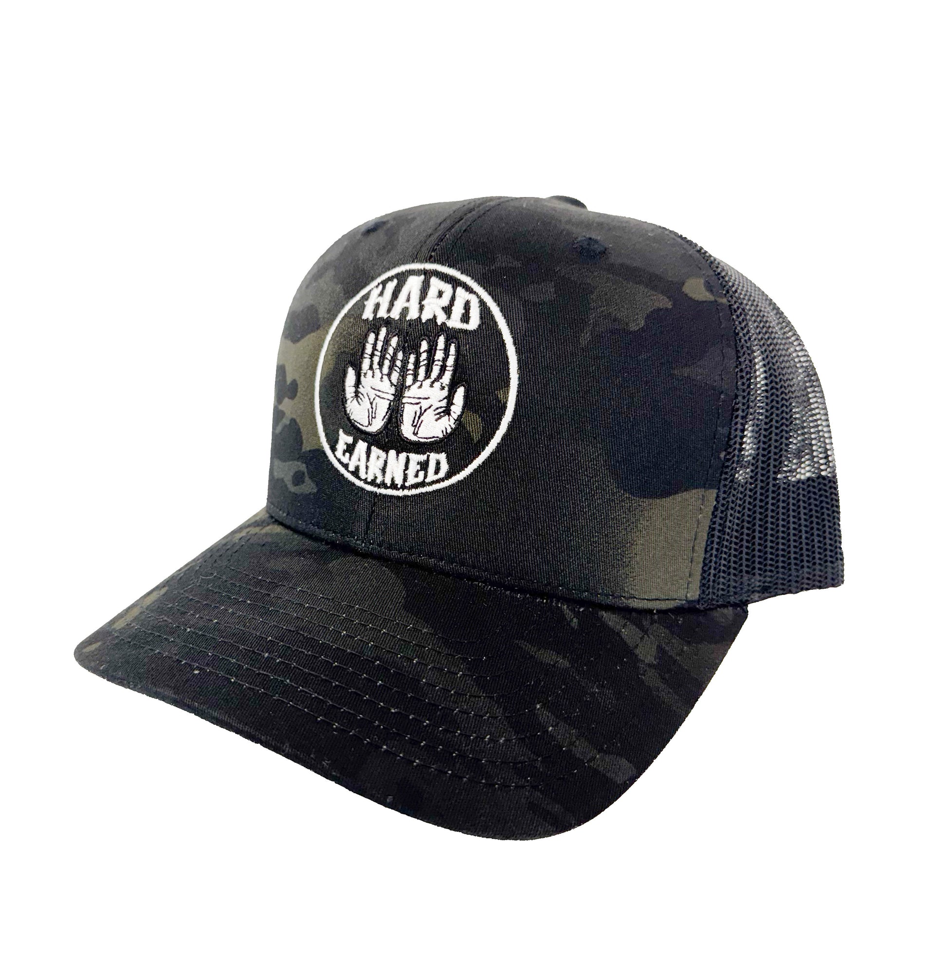Black camo Yupoong Classic trucker style hat with the OG Hard Earned Logo stitched into the front. 2.5 inch logo diameter.